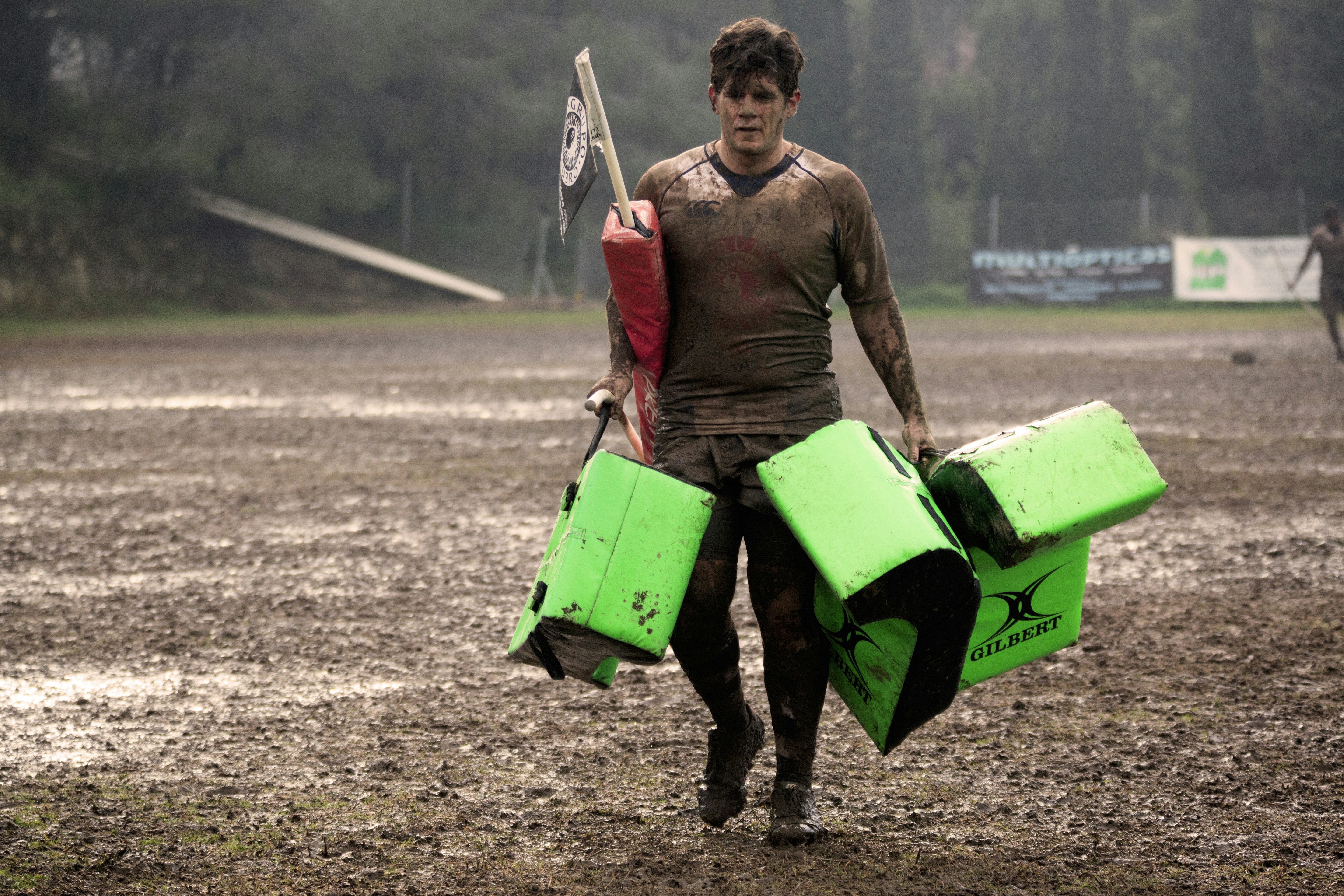 10. Man Covered In Mud Carrying Leather Training Pads Rugby Zoom Background