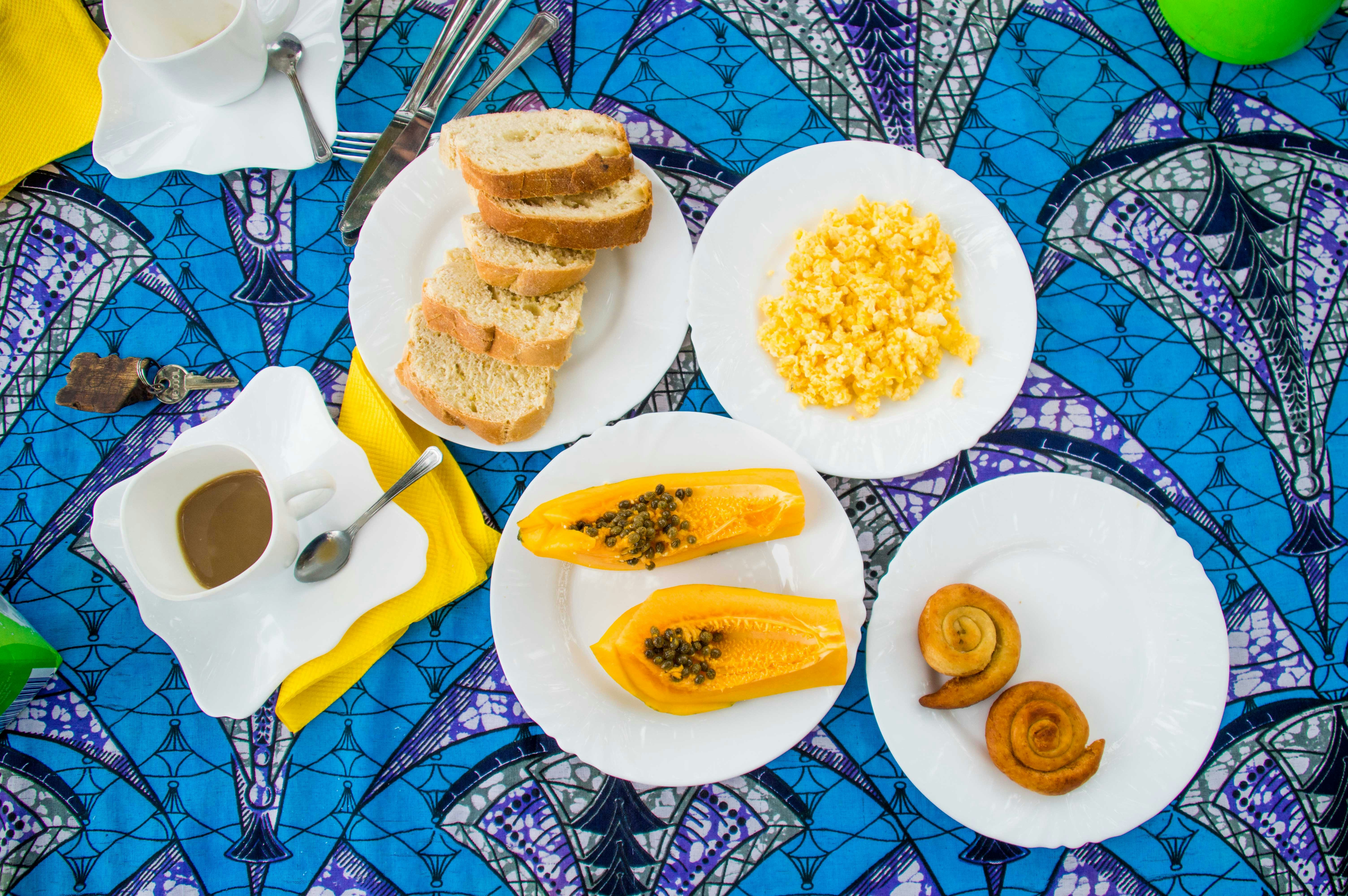 2. Sliced Papaya Fruits, Scramble Egg, Loaves Of Bread On White Ceramic Plates Sao Tome And Principe Zoom Background