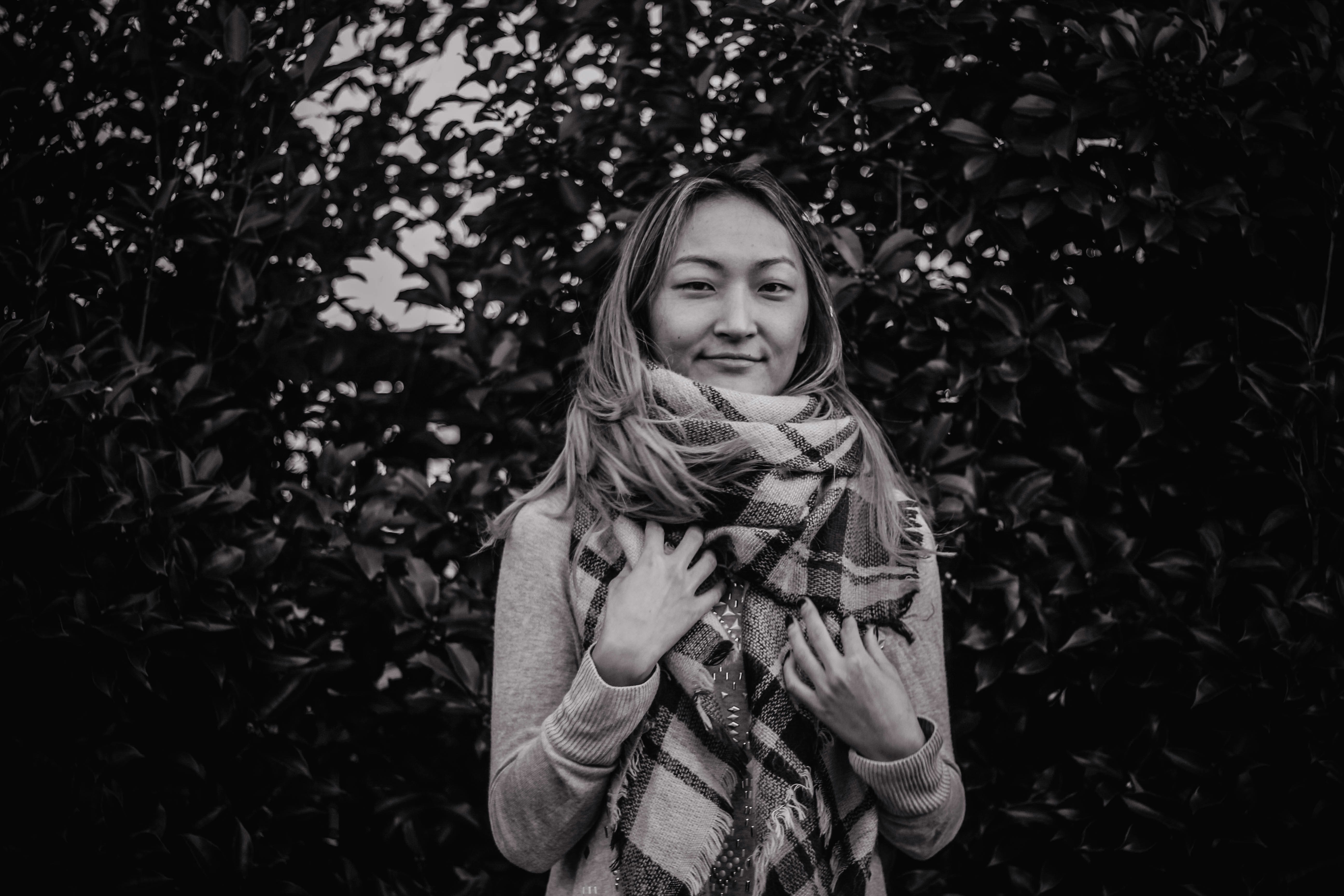 3. Grayscale Photography Of Woman Wearing Scarf Scarf Zoom Background