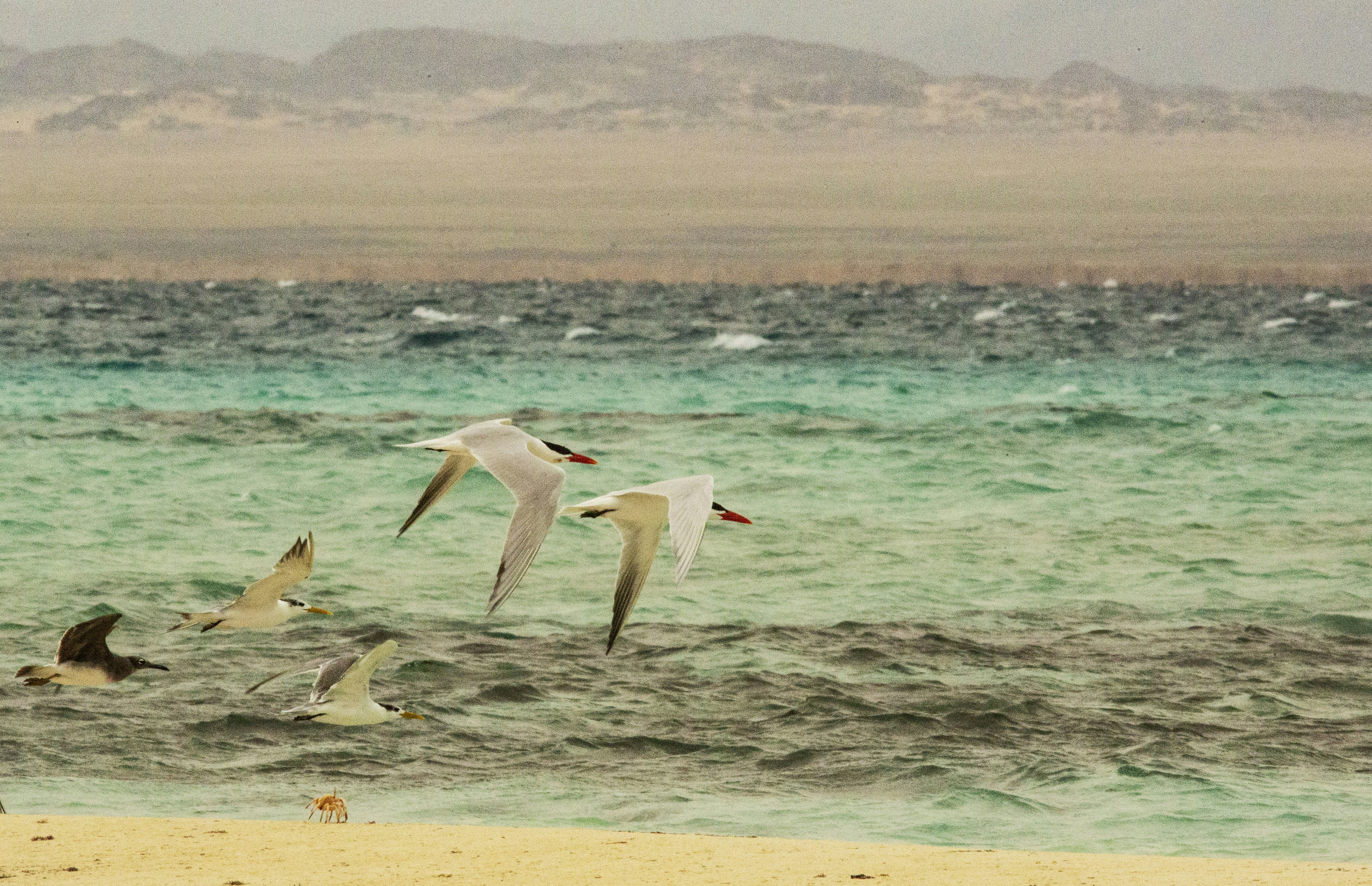 9. Five White Birds Flying Above Sea Sudan Zoom Background