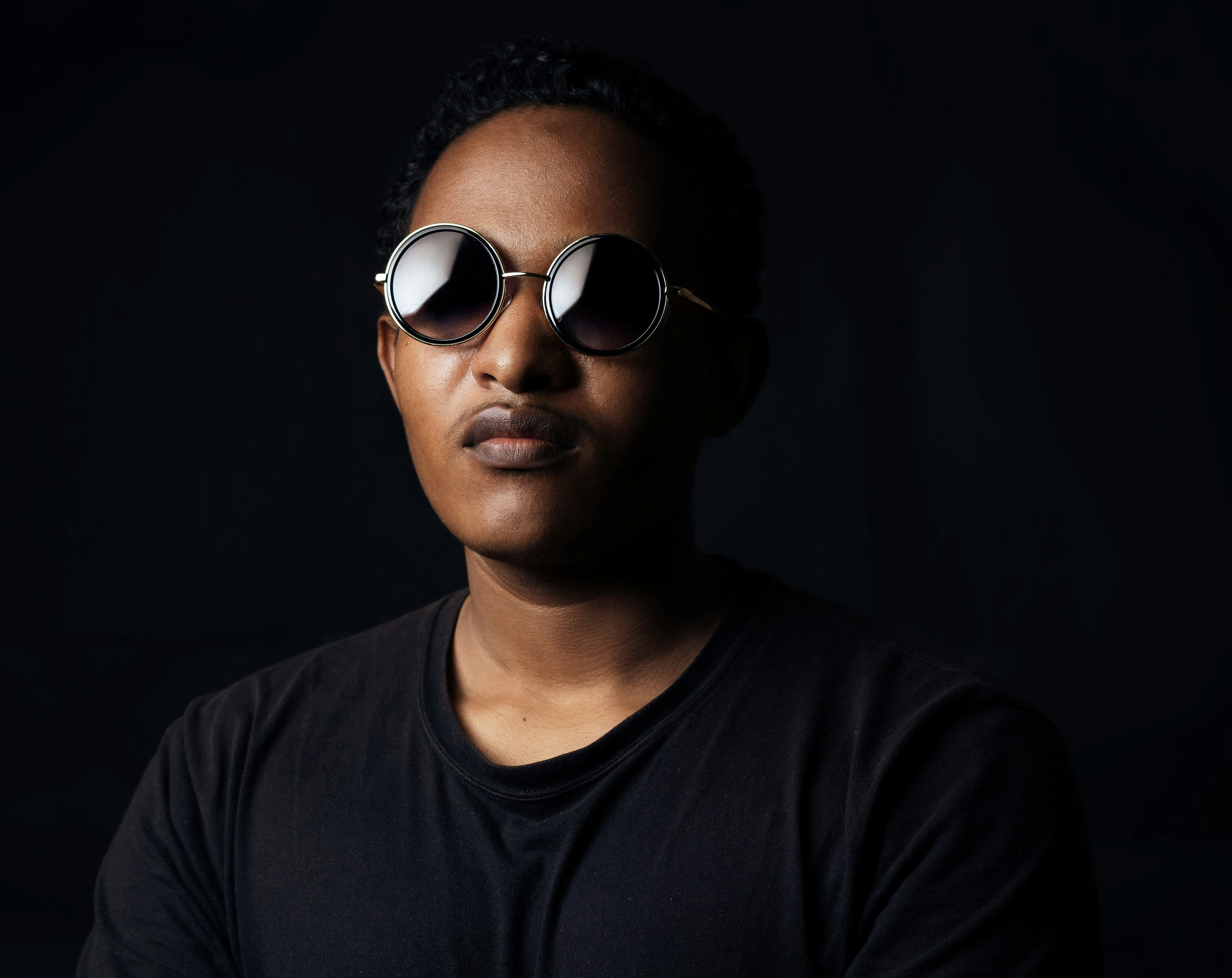 man in black crew neck shirt wearing white framed sunglasses sudan zoom background