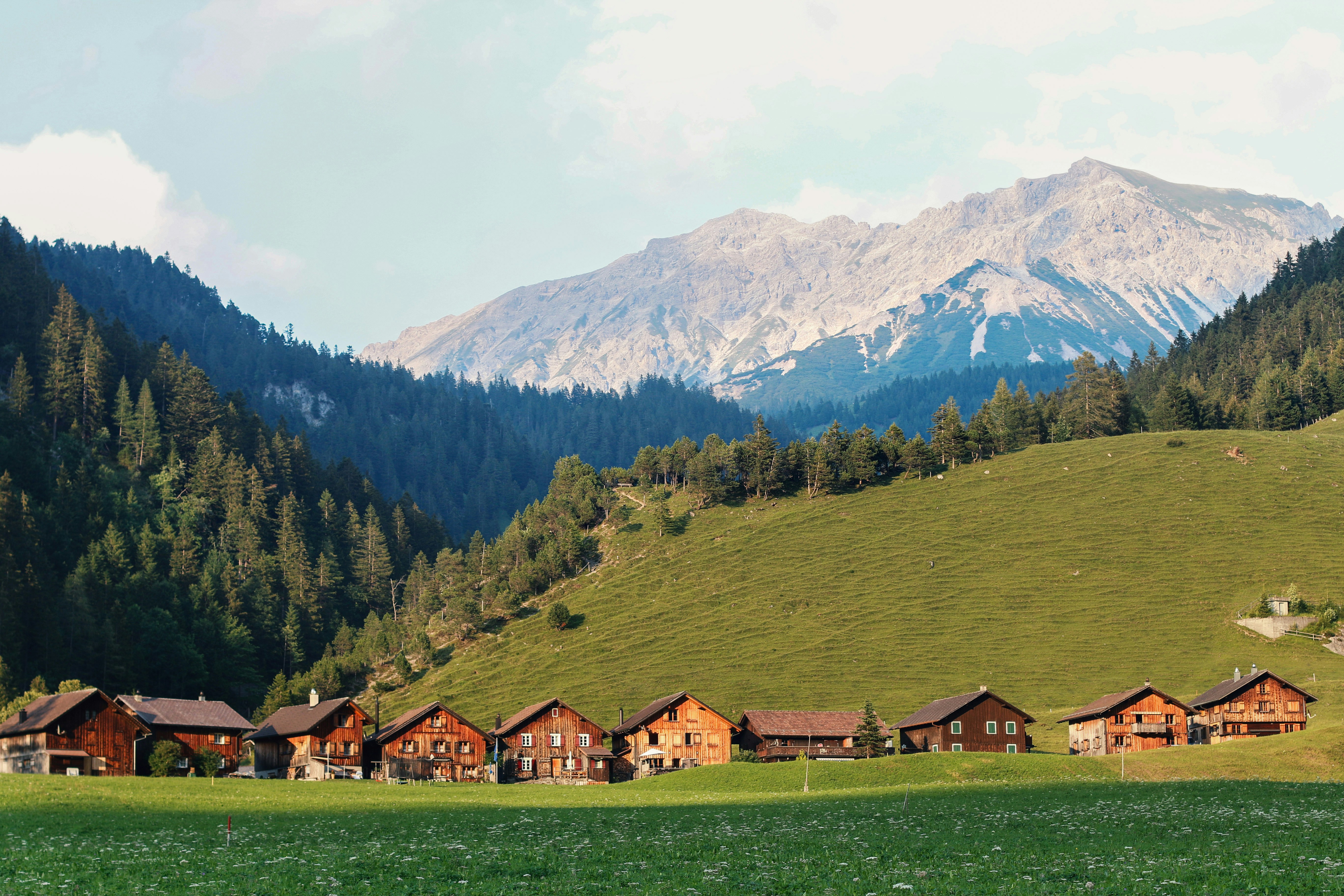 7. Brown Wooden Houses Near Green Trees And Mountain Under White Clouds During Daytime Switzerland Zoom Background