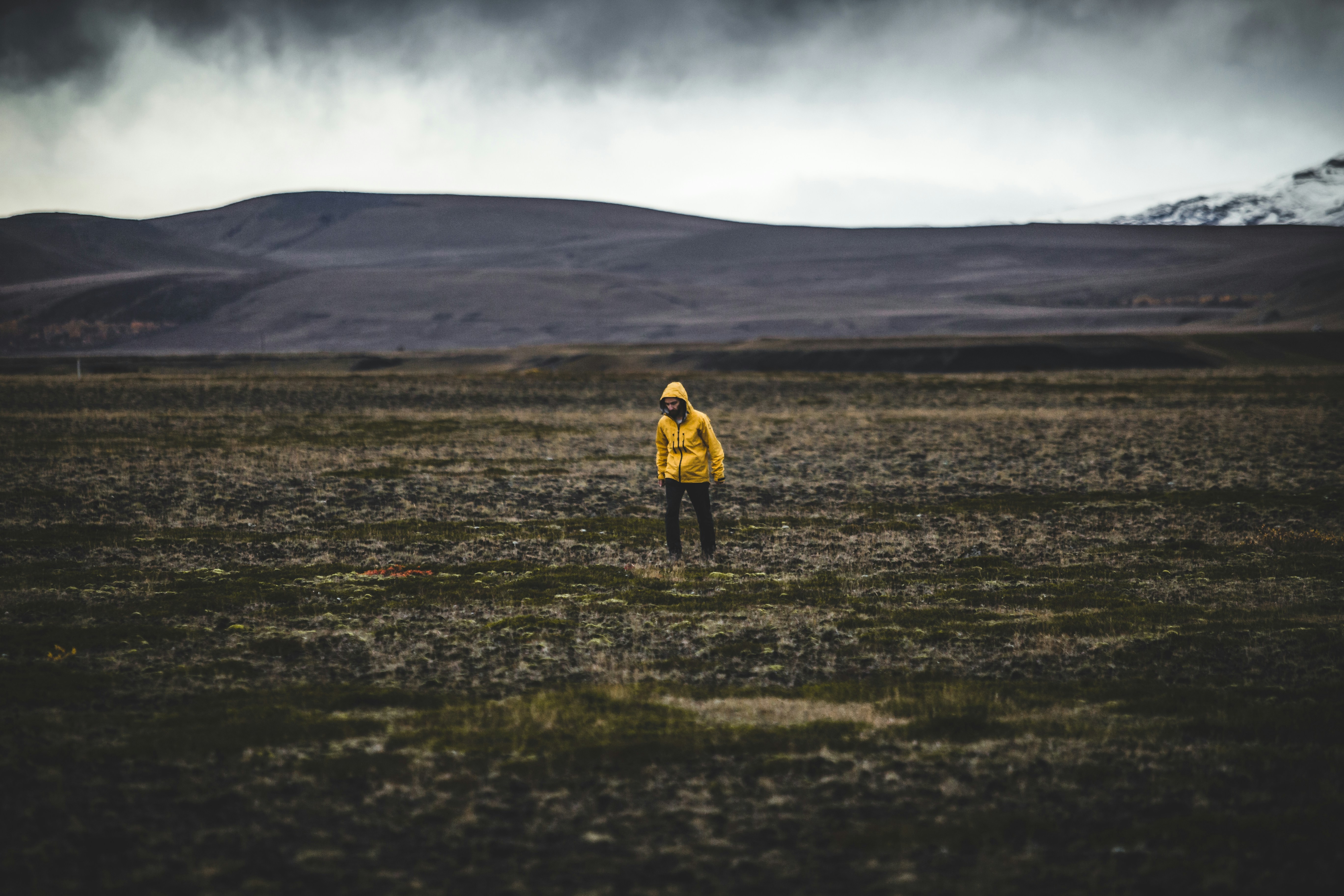 2. Man Standing On Green Grass Field Under Gray Sky Wanderer Zoom Background